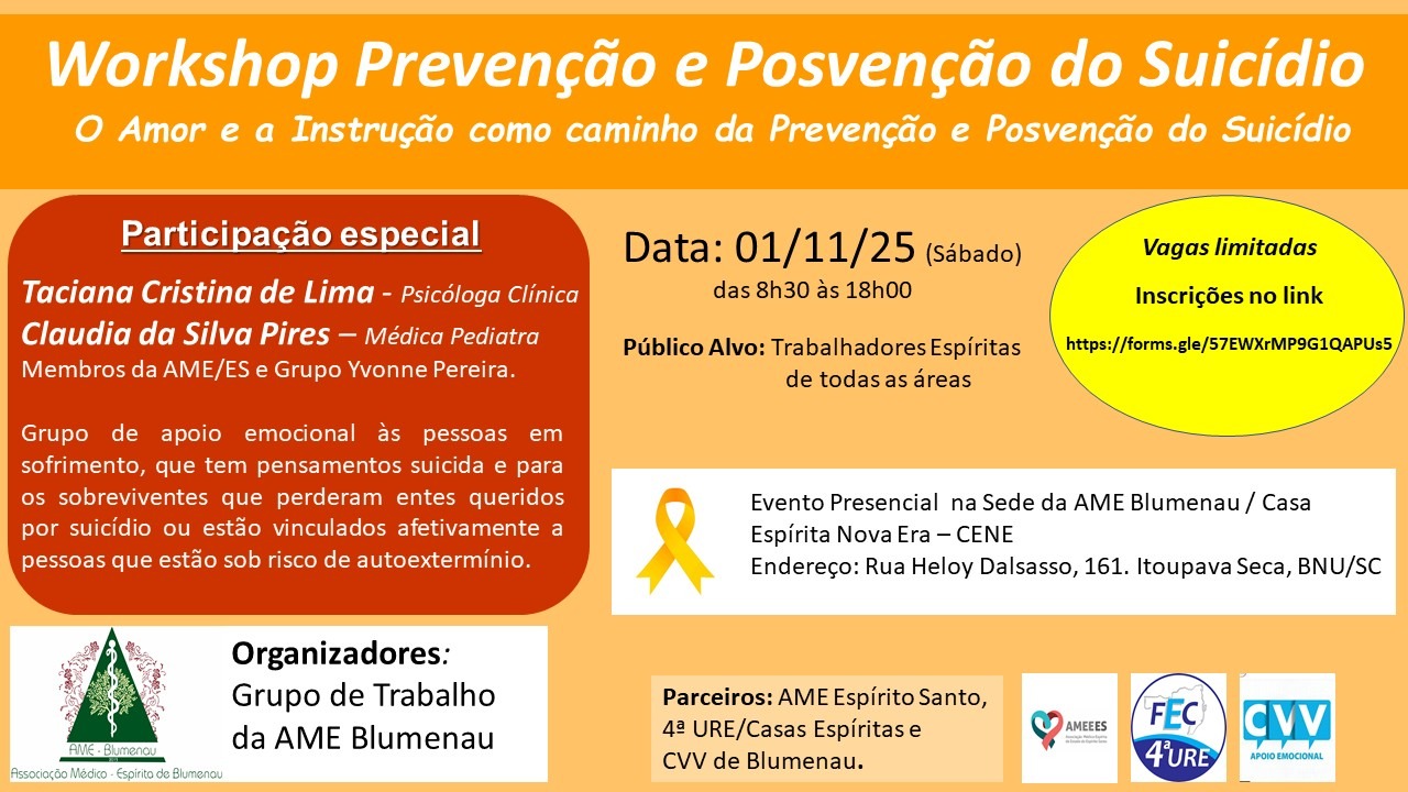 No dia 1º de novembro de 2025 (sábado), das 8h30 às 18h, será realizado em Blumenau o Workshop Prevenção e Posvenção do Suicídio, com o tema “O Amor e a Instrução como caminho da Prevenção e Posvenção do Suicídio”.